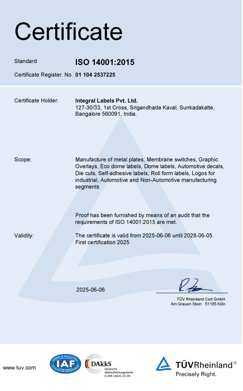 We are pleased to introduce ourselves as IATF 16949: 2016 & ISO 9001:2015 certified quality driven company. Integral Labels is an OE supplier to some of the most prestigious companies in India & Abroad. Integral Labels also cater to Automobile, Construction Equipment, White Goods, Wind Energy, Medical Industry, Solar, Electrical & Electronics Industry……Etc.